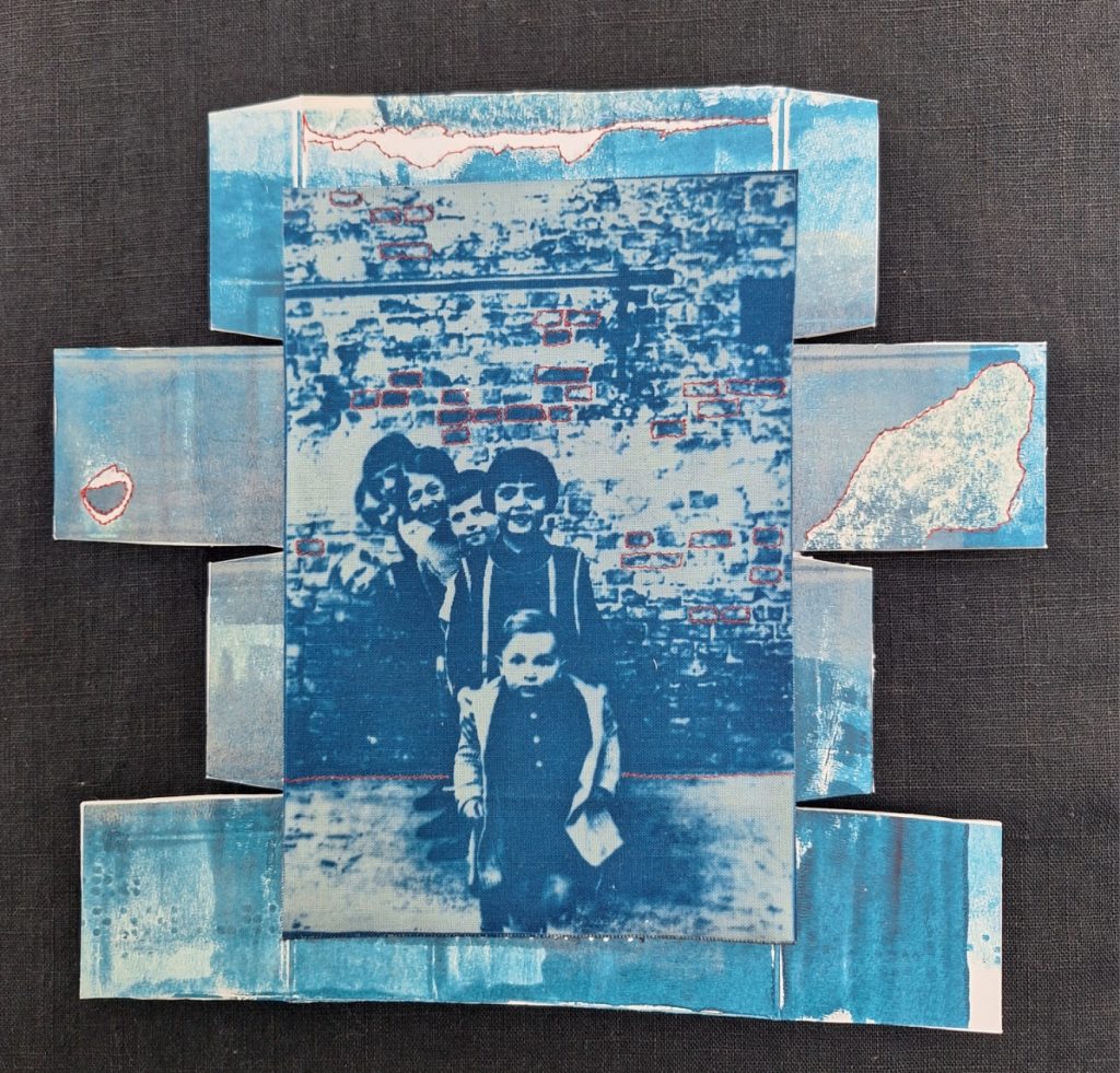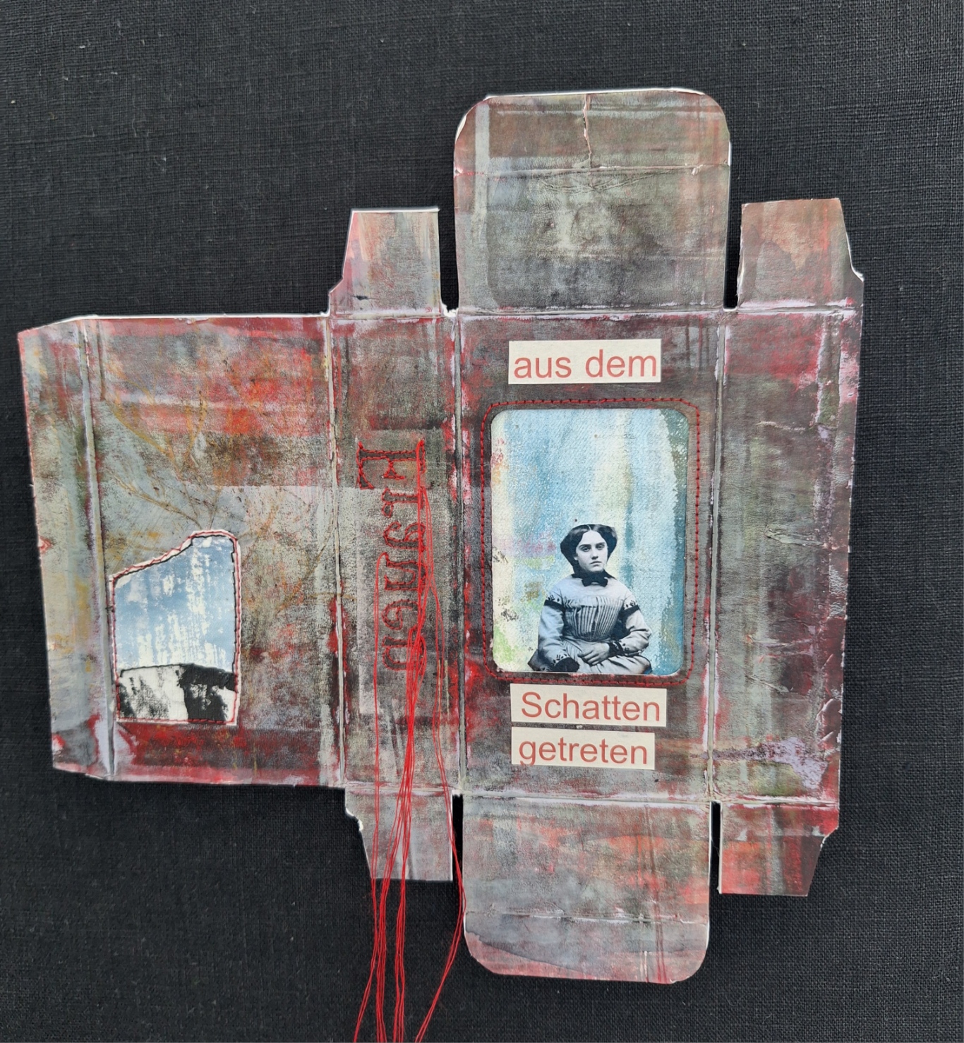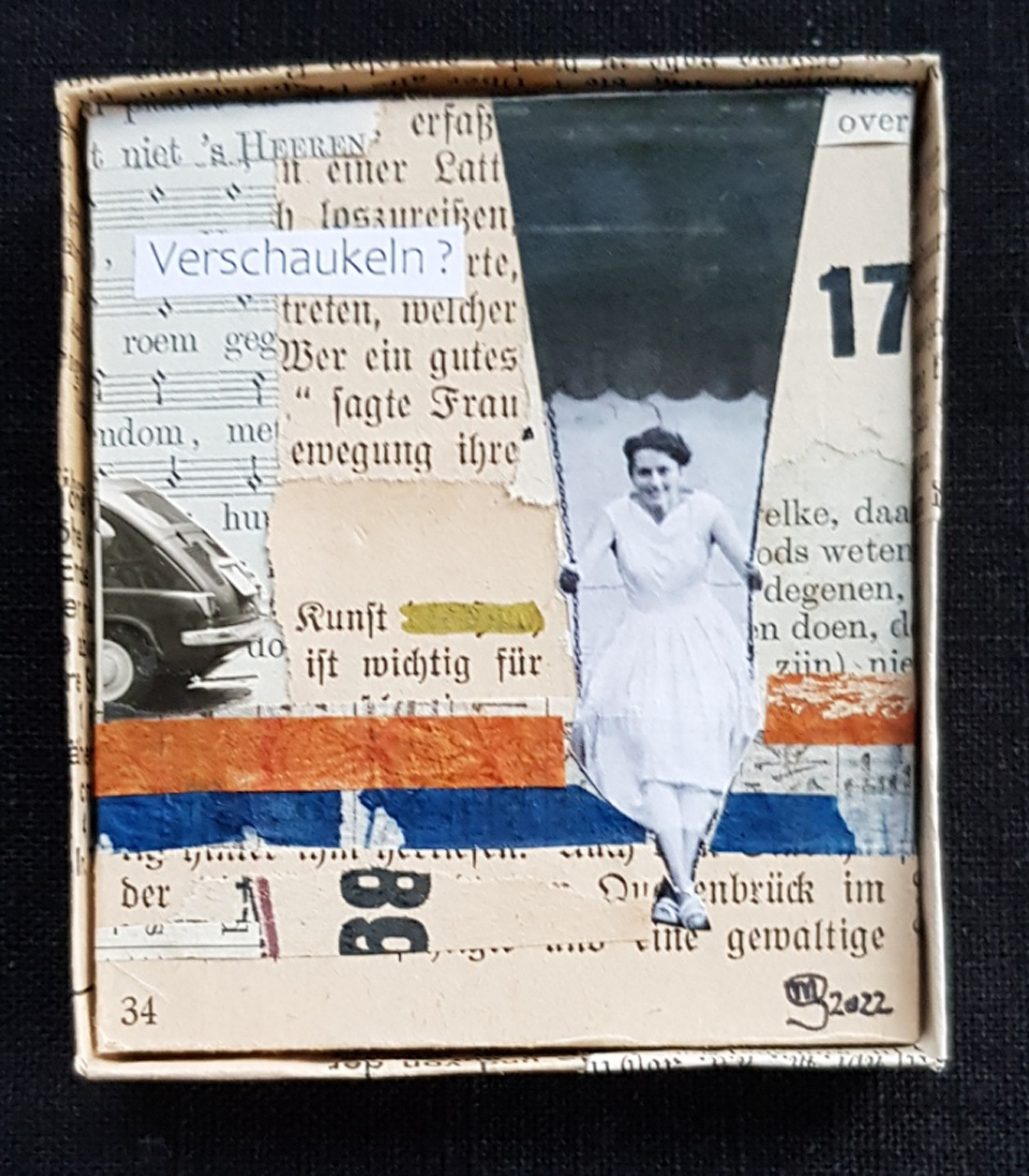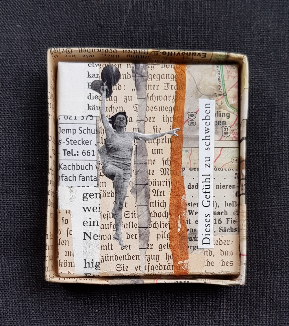 Schachtel- und Dosenobjekte Auf der Schaukel 9x7cm Die Sportlerin 9×7 cm Die Rasselbande – Cyanotypie auf Verpackungskarton Aus dem Schatten getreten, Collage auf Verpackungskarton